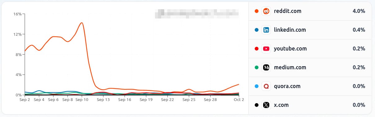 October 1st, 2025 - Reddit's stock crashed 12-13% in a single day - its steepest decline in 6 months. The trigger? Data from multiple prominent prompt trackers showed Reddit citations in ChatGPT had collapsed from roughly 14% to 2% practically overnight.