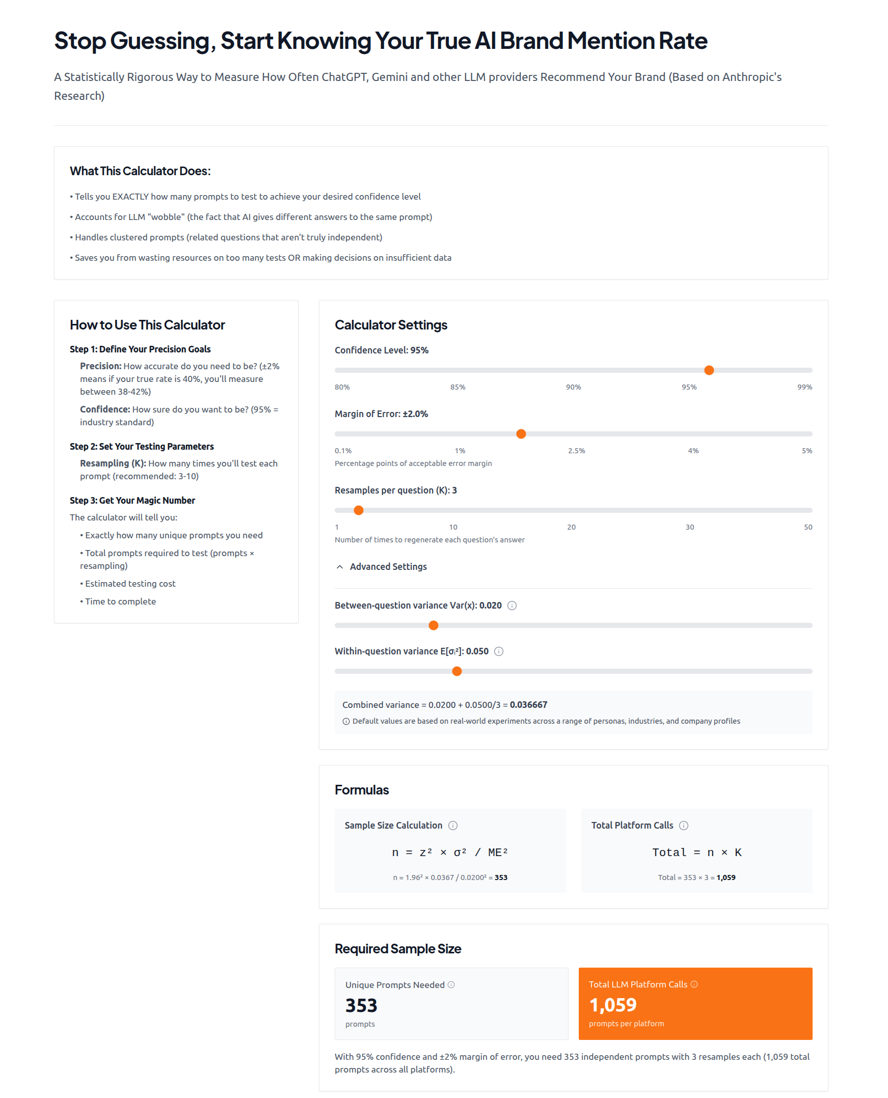 Our Testing Stack: We use authenticated API with the same tooling as free and paid users, run multiple iterations, at high volume for variance reduction, and we measure within question and question level variances to get as low a margin of error as possible. We also built a free calculator you can use to calculate your test sample size.