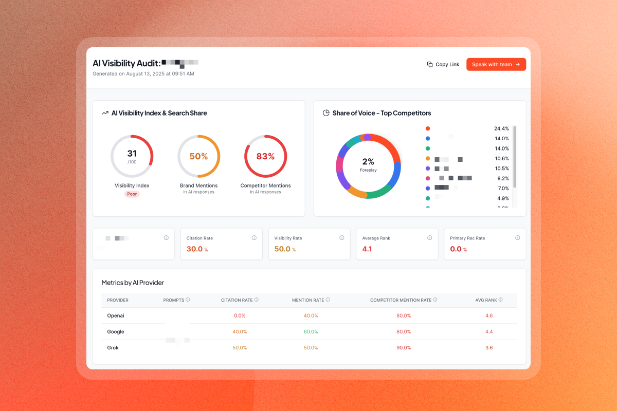 The challenge is that traditional SEO strategies don't one-to-one translate to AI visibility. Your website can rank first on Google for every target keyword while smaller competitors with less domain authority capture more share of voice in AI answers.