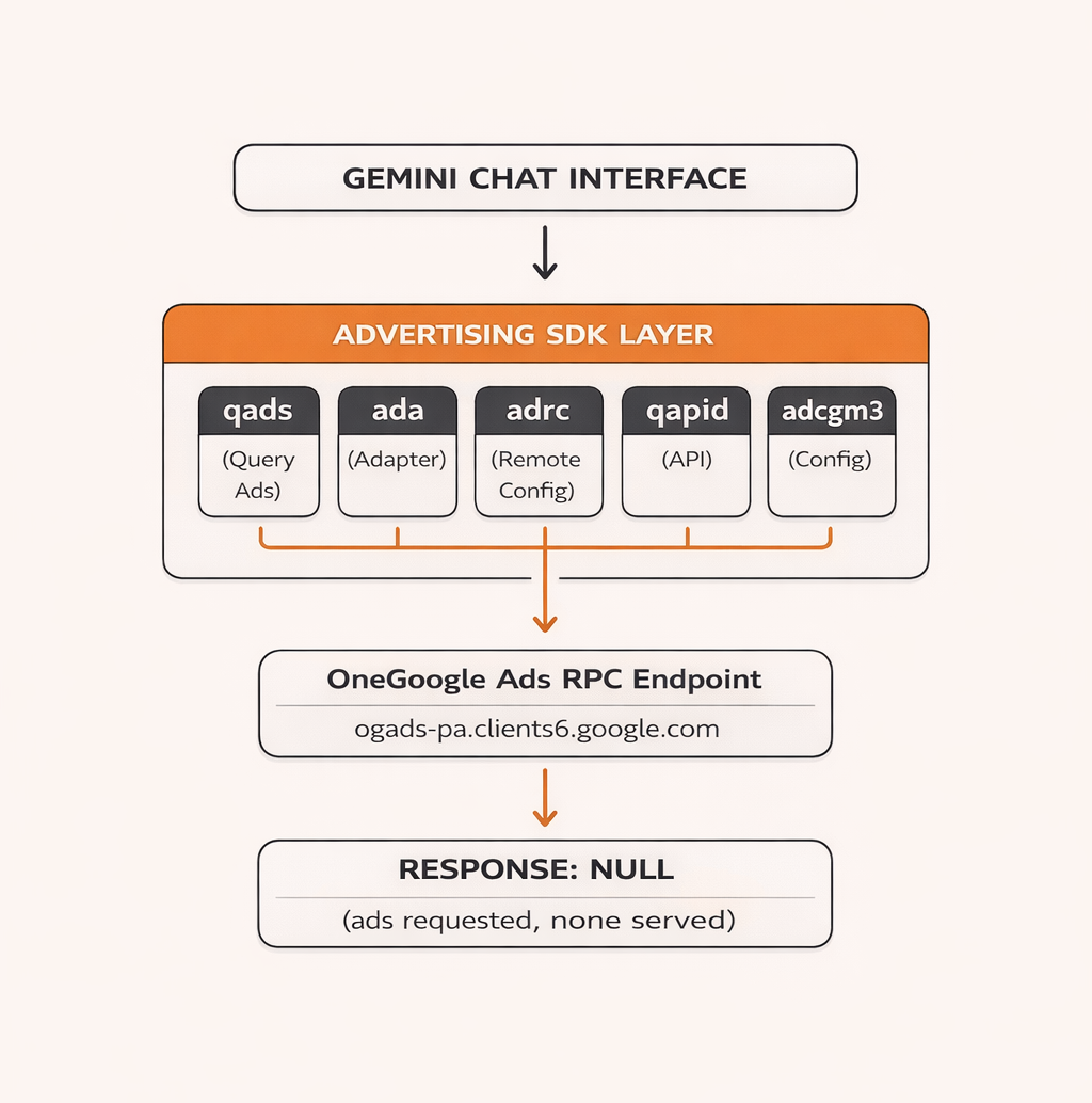 The ad infrastructure is present but dormant. Gemini loads five distinct advertising modules every time the interface opens: