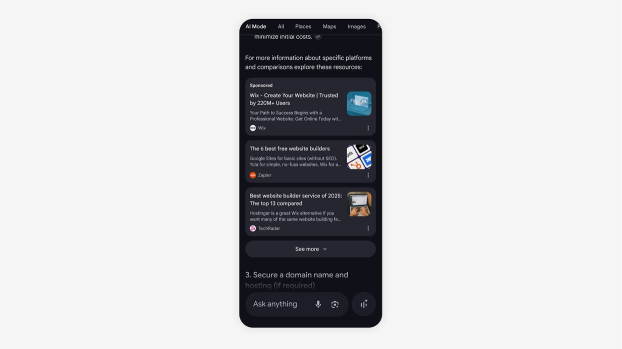 For e-commerce brands, this signals that product recommendations within AI Mode responses could become a paid placement. When someone asks AI Mode "what's the best laptop for video editing," the product cards shown in the response may eventually include sponsored products from Merchant Center.