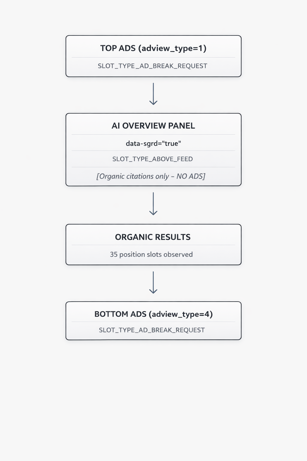 The same infrastructure that positions AI Overviews (SLOT_TYPE_ABOVE_FEED) includes 38 SLOT_TYPE_AD_BREAK_REQUEST slots in a typical search session. The technical foundation for inserting ads exists.
