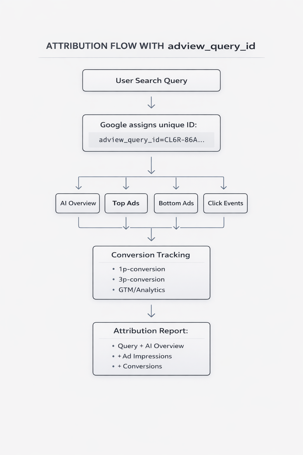 Google's attribution system connects ad impressions to specific AI-enhanced searches through a parameter called adview_query_id. This creates a direct link between what someone searched, whether they saw an AI Overview, and which ads appeared.
